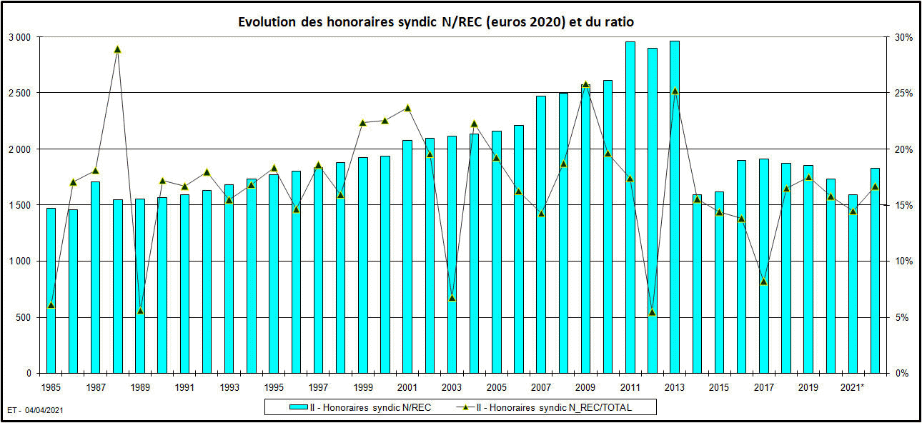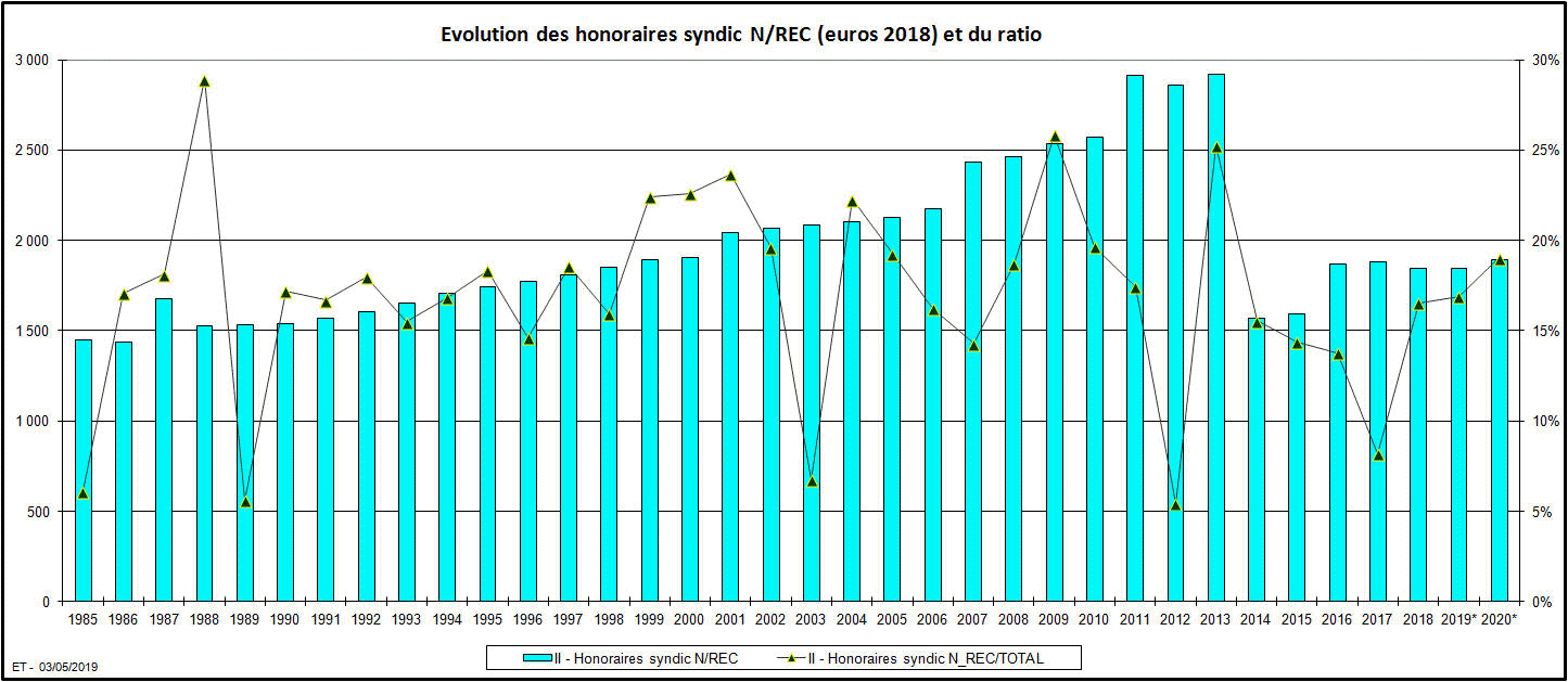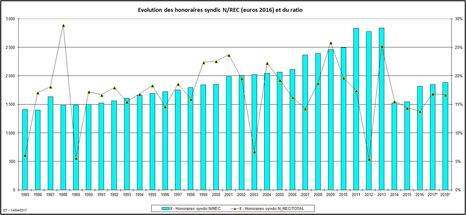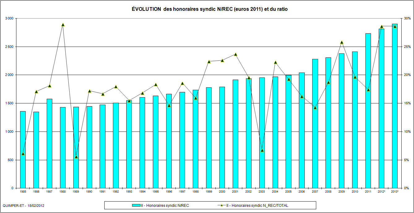 Commentaires :- les frais d'honoraires du syndic (non récupérables) progressent lentement mais inexorablement ....excepté 2011/2012 /2013...(la fin de l'ère Cheminant)....2014 début de l'ère Guirriec...puis 2016 associé à Foncia... |