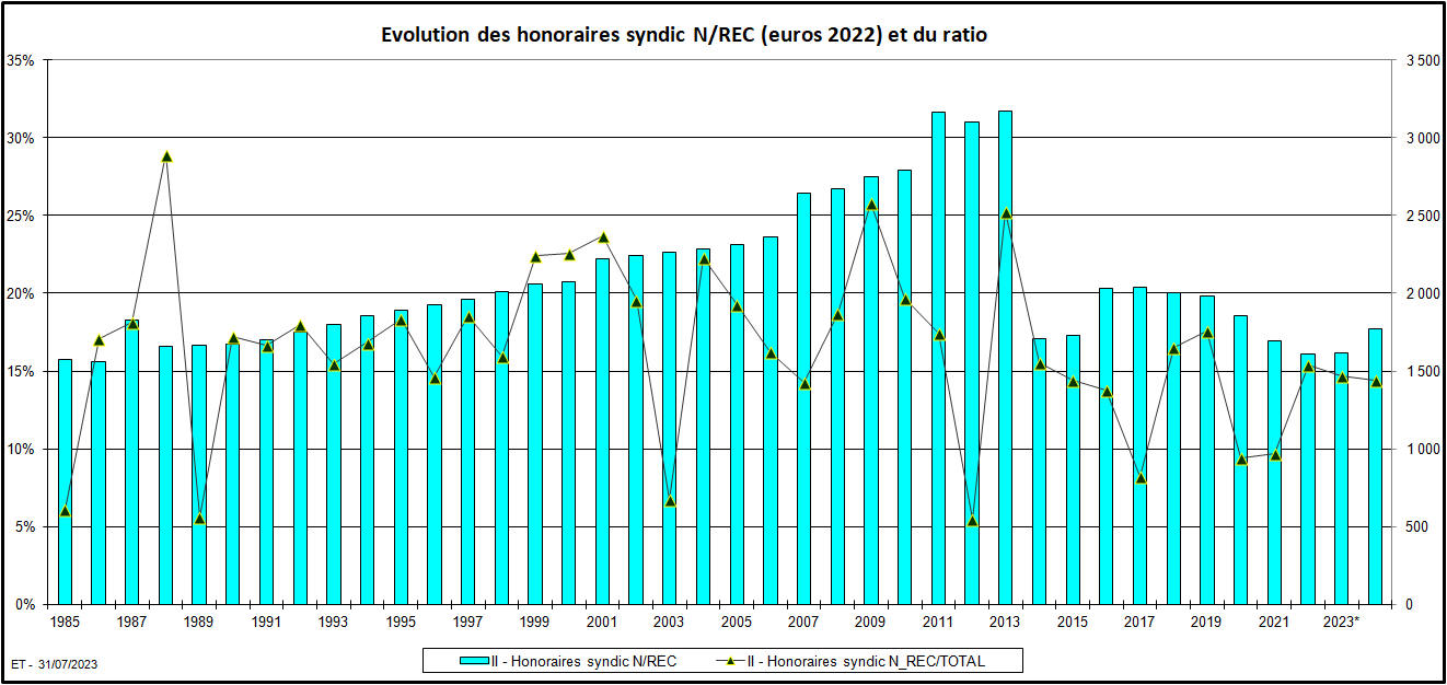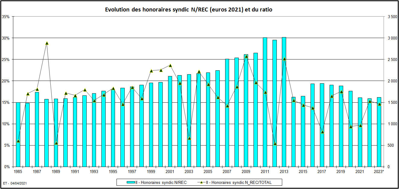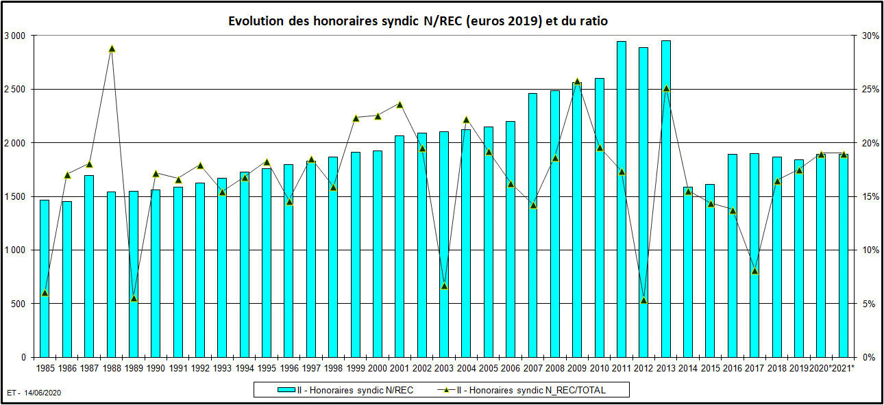 Commentaires :- les frais d'honoraires du syndic (non récupérables) progressent lentement mais inexorablement ....excepté 2011/2012 /2013...(la fin de l'ère Cheminant)....2014 début de l'ère Guirriec...puis 2016 associé à Foncia... |